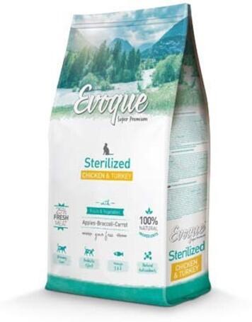 8kg Visán Evoque Cat Sterilised Chicken & Turkey with Fruits & Vegetables teljes értékű száraztáp csirkével és pulykával ivartalanított felnőtt macskák számára.