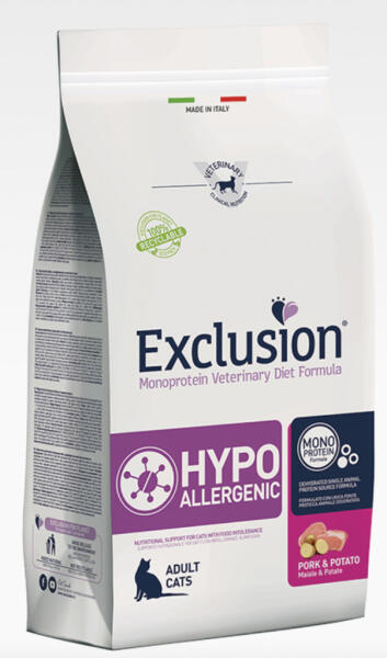 Teljes értékű diétás macskaeledel monoprotein receptúrával táplálékintoleranciában szenvedő macskáknak Az Exclusion Monoprotein Veterinary Diet Formula Hypoallergenic egy monoprotein receptúrájú diétás macskaeledel, amely egyetlen állati fehérjeforrásból és egyéb innovatív összetevőkből készül, mindezt természetes tokoferolokkal tartósítva. MACSKAELEDEL SERTÉSHÚS