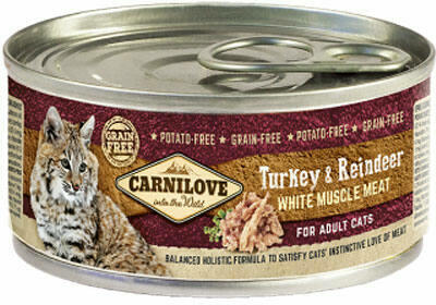 A CARNILOVE CAT Pulyka és Rénszarvas további jellemzői: Vad eredetű húsokban gazdag, valamint erdei gyümölcsöket, gyógynövényeket és lazacolajat tartalmazó nedves eledel a tökéletes fizikai állapotért és az immunrendszer támogatására. Esszenciális fehérjéket, zsírokat, vitaminokat és természetes antioxidánsokat tartalmaz. Nem tartalmaz mesterséges ízfokozót és tart