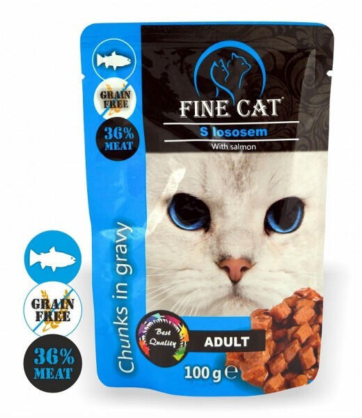Teljes értékű eledel felnőtt macskáknak -lazacos falatok mártásban - GABONA NÉLKÜL. Összetétel: 36% állati eredetű hús és melléktermékek, hal és halszármazékok (4% lazac), ásványi anyagok, növényi eredetű melléktermékek, különféle cukrok. Analitikai komponensek: Nyersfehérje: 8,50%, Nyerszsír 4,50%, Nyershamu 2,10%, Nyersrost 0,50%, Nedvesség 84,00%, Kalcium (Ca) 0