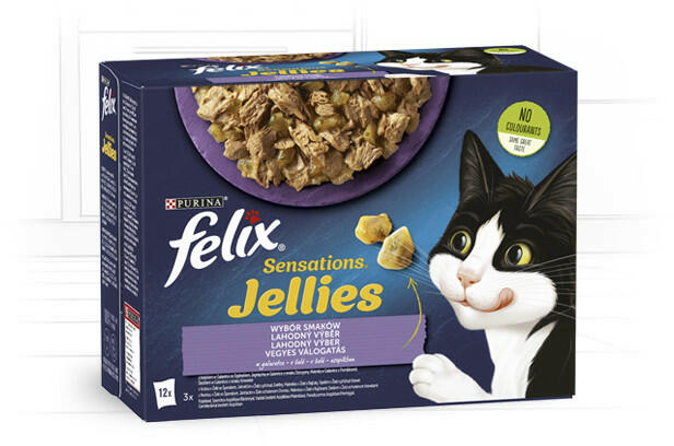 Felix Sensations Jellies Vegyes Válogatás aszpikban nedves macskaeledel 12 x 85 g (1,02 kg)Pulykával, spenótos aszpikban: hús és állati származékok* (14%, melyből bárány 4%, vad 1%), növényi fehérjekivonatok, hal és halszármazékok, ásványi anyagok, különféle cukrok, Báránnyal, vaddal ízesített aszpikban: hús és állati származékok* (14%, melyből pulyka 4%), növény