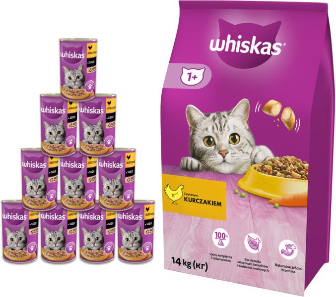 WHISKAS Száraz macskatáp 1+ csirkével 14kg - Termékleírás Teljes értékű száraz macskaeledel 1 évesnél idősebb macskáknak, csirkével, ízletes, ropogós pástétomokat tartalmaz. Ennek az eledelnek a szemcséi ideális méretűek, kifejezetten a felnőtt macskák igényeihez igazodva. A WHISKAS 1+ Száraz macskatáp csirkével enyhén csiszoló textúrájának köszönhetően segít