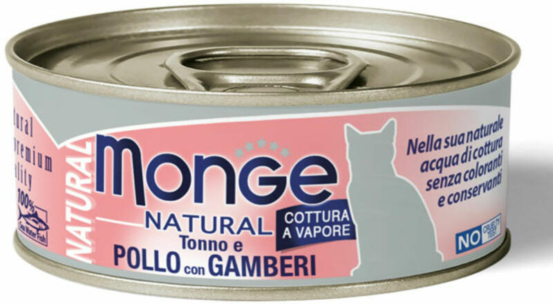 Gyártó: Monge Modell: Natural chicken & prawns 80 g Leírás: MONGE NATURAL tonhal csirkedarabokkal és garnélarákkal macskáknak 80 g, Az olasz recept szerinti párolás , valamint a természetellenes színezékek és tartósítószerek hiánya biztosítja a keverék kiváló ízét, frissességét és magas tápértékét . A konzervek még a legválogatósabb háziállatoknak és az ét