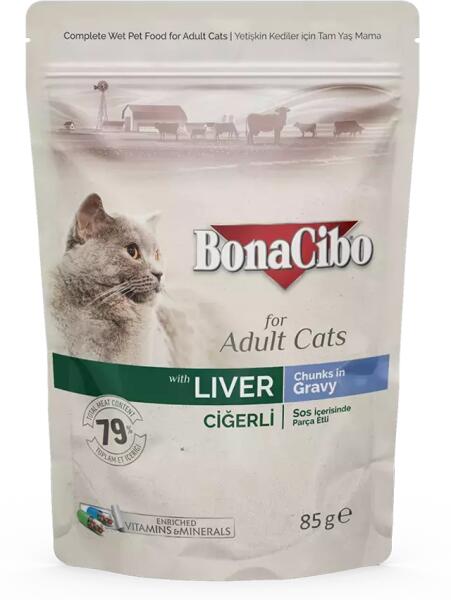 Bonacibo Pouch - Wet Adult Cat Food - Liver (12x85g) Majdarabok szaftban felnőtt macskák számára Termékjel lemzők Teljes értékű és tápláló étkezés : A Bonacibo Pouch Liver nedves eledel gazdag hústartalmával és tisztán természetes tápanyagaival biztosítja a felnőtt macskák számára szükséges táplálékot, gazdag fehérjében és zsírsavakban. Szív és szem egészsége