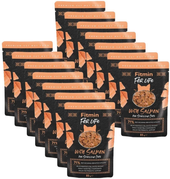 Fitmin Cat For Life Sterilizált lazac 85g - Termékleírás A macskája szereti a hal ízeket? A halhús, főként a lazac csodálatos ízét kínáljuk, akár 74% húst tartalmazó tasakban. A Fitmin lazacos tasakok sterilizált macskák számára ízletes és alacsony zsírtartalmú teljes értékű eledel. Funkcionális tasakok inulinnal dúsítva a jobb emésztés érdekében. A magas fehérj