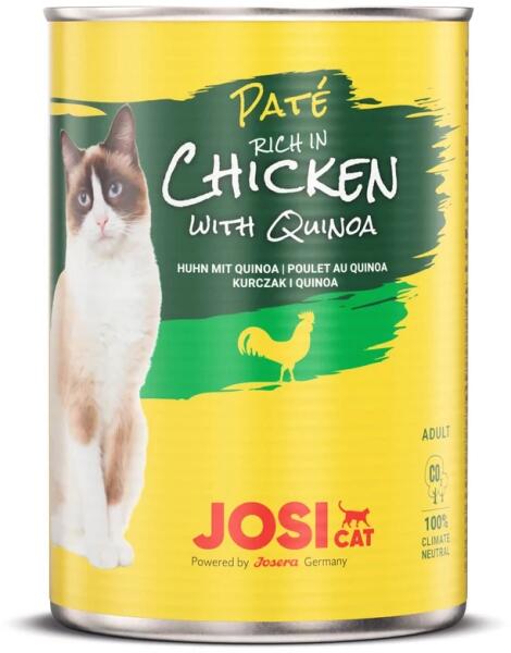 JOSICAT - CSIRKE PÁSTÉTOM KINOÁVAL A JosiCat Paté Chicken with Quinoa prémium minőségű nedves eledel felnőtt macskák részére. A kiváló íznek köszönhetően a macskák szívesen fogyasztják. A csirke pástétom kinoával fantasztikus ízélményt nyújt. Gabonamentes eledel, mesterséges adalékok nélkül. Az E-vitamin védi a sejteket a káros szabad gyököktől, míg a D3-vitam
