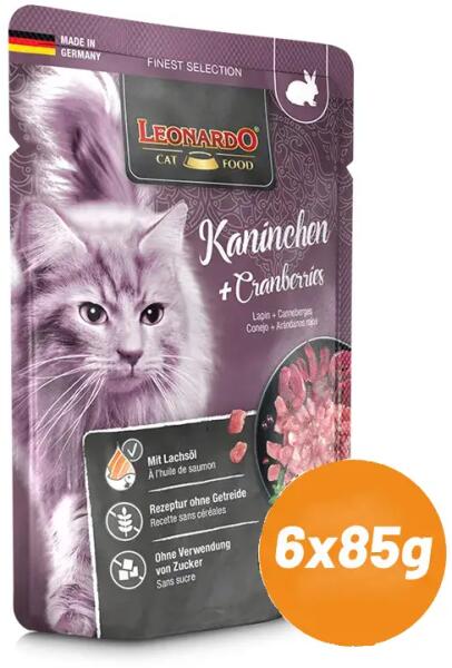 Leonardo Nyúlhús tőzegáfonyával A LEONARDO® FINEST SELECTION alutasakos macskaeledel ideális az érzékeny gyomrú és válogatós macskáknak. Szaftos húsok, finom hozzávalókkal kombinálva, melyek a Szuper Prémium nedves-eledeleknél már jól beváltak. Kevert etetésre kifejezetten alkalmas és ajánlott is a LEONARDO® Szuper Prémium szárazeledelekkel. Egészséges lazacolajat ta