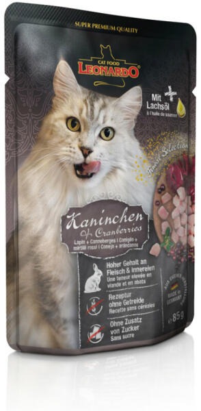 Jellemzők: - Kiváló receptúrák egy etetési méretben csomagolva. - Szaftos, finom hozzávalókkal ízesített, kíméletesen főzött hús, tasakba kiporciózva. - A lazacolaj a sokoldalú telítetlen zsírsavak szállítója. Összetétel: Nyúlhús, szív, máj, tüdő, vese (30 %); Csirkehús, máj, szív (30 %); Nyúl-, csirke-, marhahúslé (28,3 %); Marhatüdő (6,5 %); tőzegáfonya (