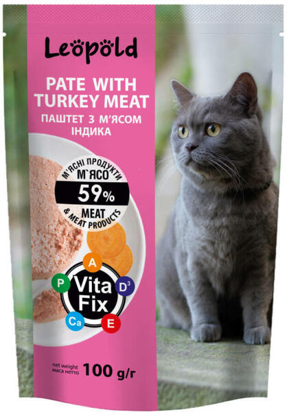 Húspástétom pulykahússal macskáknak 100gÖsszetétel: hús és húskészítmények min. 59%), gabonafélék, zöldségek, zselésítő adalékanyag, ásványi anyagok, ivóvíz. Nem tartalmaz szóját, tartósítószert, csalogatóanyagot, aromát, színezéket, ízfokozót vagy sót. Természetes húsból készült. Nincs ellenjavallat a sterilizált állatoknál történő felhasználásra.