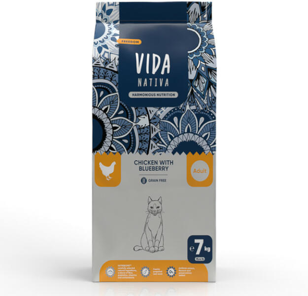 Craftia Száraz macskatáp, csirke és áfonya , 7 kg Összetevők: csirkefehérje (24%), burgonya, borsókeményítő, nyers csirkehús (11%), csirkezsír, hidrolizált baromfifehérje, dehidratált tojás, lenmag, halolaj (lazacból), áfonya (4%), brokkoli (4%), spárga, spenót, szárított répapép, lucernatakarmány, borsórost, kalcium-karbonát, monokalcium-foszfát, kálium-klorid, nátr