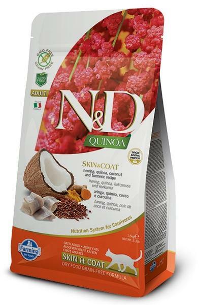 Összetevők és tápanyagok:Friss, vadon kifogott hering (18%), hidrolizált hering (18%), borsókeményítő, halolaj (heringből), quinoa mag (8%), szárított kókusz (2,5%), kurkuma (2,5%) inulin, frukto-oligoszacharidok, élesztő kivonat (mannán-oligoszacharidok forrása), útifű, kalcium-karbonát, dikalcium-foszfát, kalcium-szulfát-dihidrát, kálium-klorid, nátrium-klorid, száríto