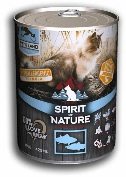 A Spirit of Nature Cat konzerv Tonhallal és lazaccal további jellemzői: Speciális gyógynövénykeverék tartalma általános immunerősítő és segíti a méreganyagok kiürülését a szervezetből, így az állat egészsége és vitalitása sokáig magas szinten maradhat. tökéletes egyensúly a minőségi alapanyagokból rendelkezésre álló energia és az emésztési problémákkal kü