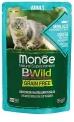Monge Cat BWild Grain Free Adult tőkehal, garnéla és zöldségek - teljes értékű, gabonamentes, szószos nedvestáp macskák számára, tőkehallal, garnélával és különféle zöldségekkel.