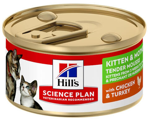 A kölyök- és anyamacskák számára kifejlesztett Hill's Science Plan Kitten & Mother csirkés és pulykás omlós pástétom egy lágy állagú, teljes értékű és kiegyensúlyozott eledel kölyökmacskáknak és vemhes vagy szoptató macskáknak. Pontosan kiegyensúlyozott formulája megfelelő energiamennyiséget biztosít a kölyökmacskáknak életük kezdeti szakaszában, valamint a