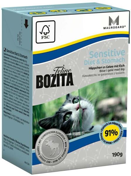 BOZITA Feline Sensitive Diet gyomor 190g - Termékleírás Szereti a macskája piszkálni a tálját? Vagy érzékeny az emésztőrendszere, ezért sok étel okoz hányást vagy hasmenést? Akkor próbálja meg etetni a BOZITA Feline Sensitive Diet Stomach 190 g. Ez az érzékeny macskáknak szánt nedves eledel elsősorban hús alapon készül. Macskáknak Összetétel Csirke Jáv orszarvas (4% d