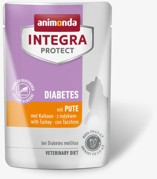 Diétás nedves eledel cukorbeteg macskáknak (Diabetes mellitus), hozzáadott cukor és keményítő nélkül, fehérjében és húsban gazdag receptúra, magas befogadóképesség, kiegyensúlyozott ásványianyag-tartalom, kevesebb szénhidrát. Ha macskája cukorbetegségben szenved, szükség lehet speciális diétás táplálék használatára. Erre a célra készült az Animonda Integra Pro