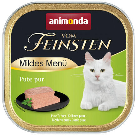 A Vom Feinsten Adult Mildes Menu a kiegyensúlyozott, ízletes, egészséges táplálkozást jelenti a legmagasabb szinten 1 és 6 éves kor közötti felnőtt macskák számára. A kizárólag jól emészthető pulykahúsból készült ízletes receptek - belsőségek és máj nélkül - különleges élvezetet kínálnak a macskáknak. A finomra vágott piték minden szükséges tápanyagot bizt