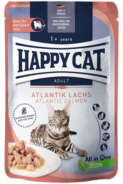 Happy Cat Meat in Sauce Culinary Atlantik-Lachs Ivartalanított macskáknak A természetesen fényes szőrzetért LazacA Happy Cat Meat in Sauce Atlantik-Lachs (Lazac) a felnőtt ínyenceket omlós lazaccal kényezteti, finom mártásban. Az ízletes receptúra értékes omega-3 és omega-6 zsírsavakat tartalmaz, és támogatja a szőrzet természetes fényét, valamint mindent biztosít a macsk