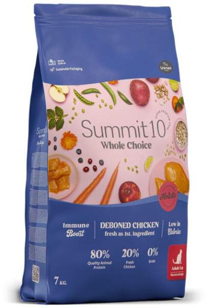 Summit 10 Whole Choice Neutered Teljesértékű gabonamentes száraz macskatáp friss csirkehússal és lazacfehérjével, kifejezetten ivartalanított és/vagy túlsúlyos felnőtt macskáknak. Kifejezetten ivartalanított vagy túlsúlyos, 12 hónaposnál idősebb felnőtt macskáknak igényeire szabott receptúra, hiszen a benne található friss, alacsony kalóriatartalmú csirke részt vesz a
