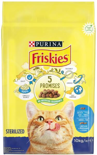 Jellemzők: A Friskies® 5 ígérete. Attól a naptól kezdve, hogy macskádat hazaviszed, el is kötelezed magad. Megígéred, hogy törődni fogsz vele, megfelelően eteted és segítesz neki, hogy boldog és egészséges életet élhessen és minden nap boldogsággal tölthesse meg otthonodat. A Friskies több évtizedes tapasztalatára és szakértelmére támaszkodva táplálja a boldog és e