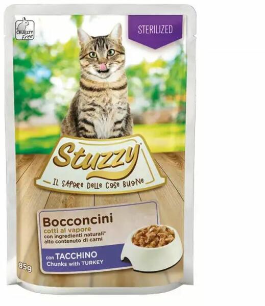 Stuzzy Cat Sterilized Chunks teljes értékű eledel ivartalanított macskáknak, párolással készítve, mely még vonzóbbá teszi a macskák számára. Puha, könnyen emészthető húsdarabkák vitaminokkal és tápanyagokkal teli szószban Fontos taurint és E vitamint tartalmaz, mely jótékony hatást gyakorol a macskák szívére és látására Tartósítószerek vagy ételfesték hozzáa