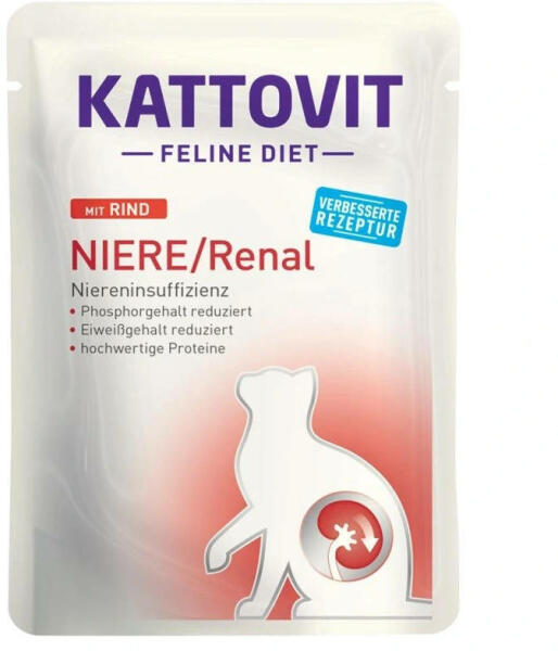 A Kattovit Feline Diet - NIERE/RENAL speciális eledel krónikus veseelégtelenségben szenvedő macskák számára, és csökkenti az oxalátkő-képződést. A megfelelő folyadékbevitel segít megelőzni a vesebetegséget. A vesebetegségre hajlamos állatoknál a túl magas fehérjetartalmú táplálék hozzájárulhat a veseelégtelenséghez. Ezért a Kattovit Renal eledelben a hagyományos