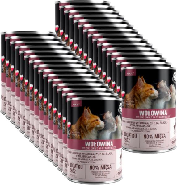 Marhahús, szeletelt darabok finom mártásban, 400g. Szeletelt marhahúsdarabok minden fajta macskának, finom mártásban tálalva, amely meghívást jelent egy ízletes étkezésre. Darabonként 90% hús és állati eredetű termék!NINCS ZÖRZSÉG ÉS CUKOR hozzáadásával, hozzáadott vitaminokkal és ásványi anyagokkal. A-vitaminnal: a megfelelő szemműködésért D3-vitaminnal: az erős