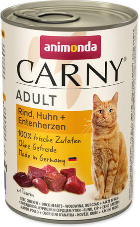 9.6kg Az Animonda Carny Adult marhás, csirkés és kacsaszíves konzerv egy tiszta húsból készült macskatáp a valódi zamat érdekében. Garantáltan szójamentes, mesterséges színező- és ízanyagok nélküli.