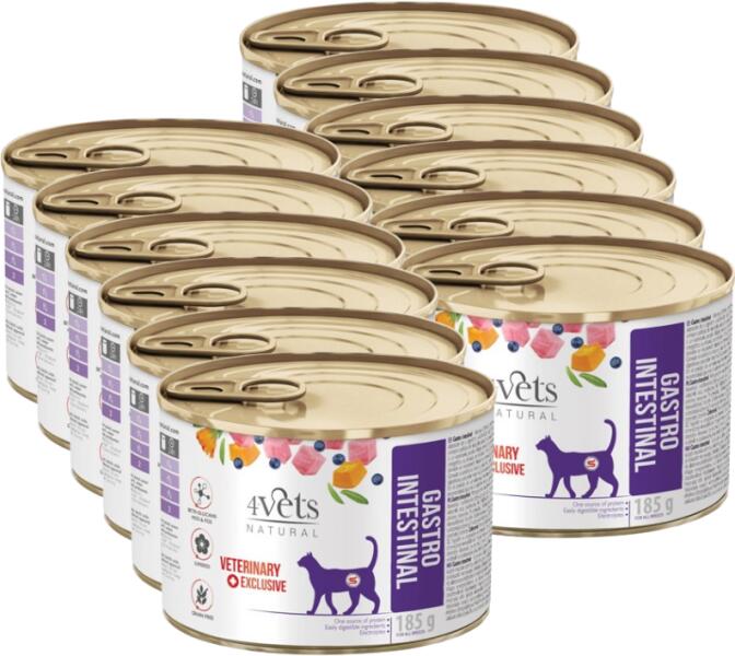 A 4vets Gastro Intestinal állatorvosi táp teljes értékű speciális eledel az emésztési és bélrendszeri felszívódási zavarok tüneteivel küzdő, hasmenéses és gyulladásos gyomor- és bélrendszeri állapotú macskák számára. Könnyen emészthető összetevőket, alacsony zsírtartalmat és fokozott elektrolitokat tartalmaz az emésztési problémák miatt elveszett anyagok pótl
