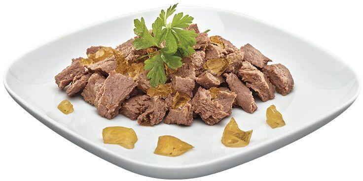 Teljes értékű nedves táp, kiegyensúlyozott kalóriatartalmú. A recept korlátozott számú összetevőből és egyetlen fehérjéből áll. Gabona- és gluténmentes, így könnyen emészthető. 100%-ban a legmagasabb minőségű meghatározott összetevőket tartalmazza. Az étel esszenciális taurint tartalmaz, amely különösen fontos a látás és a szívműködés szempontjából. A ma