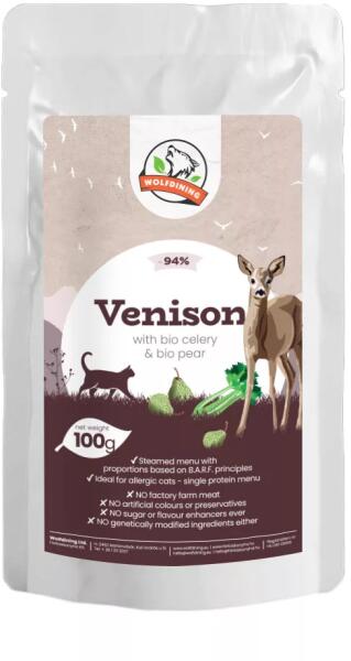 Jellemzők: - 94% ŐZ párolt menü bio zelerrel és bio körtével gazdagítva, nyakon öntve bio ligetszépeolajjal. - Kizárólag etikus gazdálkodásból származó friss húst, bio zöldséget és gyümölcsöt dolgozunk fel, amelyeket kontrollált, alacsony hőmérsékleten párolunk készre az értékes tápanyagok és az ízek megőrzéséért. - Teljes értékű menü felnőtt macskáknak