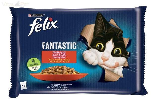 Felix 4x85 g Csirke&Marha MP A FELIX Fantastic termékek olyan étvágygerjesztőek, mintha te magad készítetted volna! Puha húsos falatkák zamatos aszpikban, melynek a cicád nem tud majd ellenállni! ETETÉSI ÚTMUTATÓ : Egy átlagos súlyú (4 kg) felnőtt macska napi adagja 3-4 tasak, legalább 2 külön étkezésre elosztva. Az etetési útmutatóban szereplő mennyiségek mérsé