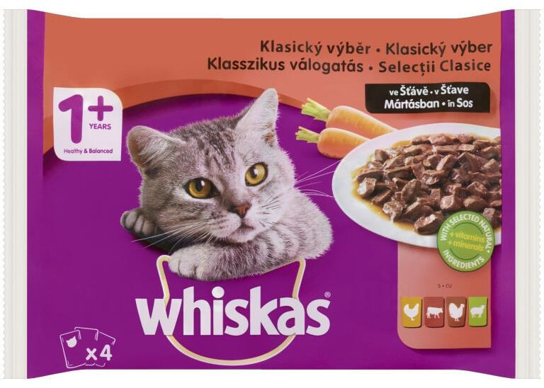 Whiskas alutasak 4-pack Marha-Csirke mártásban 4x85g Multipack Összetevők Csirkehússal és zöldborsóval: hús és állati származékok (ebből 4% csirkehús), zöldségek (ebből 4% zöldborsó) válogatott gabonafélék, ásványi anyagok, különféle cukrok Marhahússal: hús és állati származékok (ebből 4% marhahús), válogatott gabonafélék, ásványi anyagok, különféle cukr