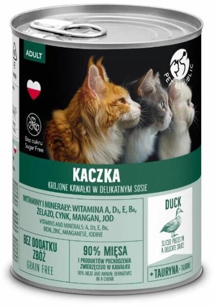 Pet Republic finomra vágott kacsadarabok finom mártásban 400g Apróra vágott kacsadarabok minden fajta macskának, finom mártásban tálalva, amely meghívást jelent egy finom étkezésre. 90% hús és állati eredetű termék a felvágottban! NINCS ZÖRZSI ÉS CUKOR hozzáadásával, hozzáadott vitaminokkal és ásványi anyagokkal. A-vitaminnal: a megfelelő szemműködésért D3-vitaminn