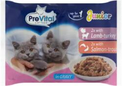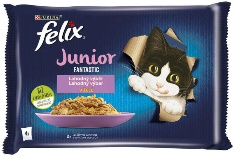 Felix Fantastic Junior Csirkével/Lazaccal aszpikban nedves macskaeledel 4 x 85 g (340 g)Csirkével aszpikban: hús és állati származékok* (20%, melyből csirke 8%), növényi fehérjekivonatok, hal és halszármazékok, növényi eredetű származékok, ásványi anyagok, különféle cukrok, Lazaccal aszpikban: hús és állati származékok* (18%), növényi fehérjekivonatok, hal és halsz