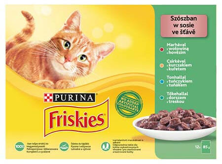 FRISKIES Szószban Marhával/Csirkével/Tonhallal/Tőkehall al nedves macskaeledel 12x85g Összetétel : Hús és állati származékok (melyből marha 4%), Gabonafélék, Ásványi anyagok, Különféle cukrok. Adalékanyagok :Táp értékkel rendelkező adalékanyagok:NE/kg: Vit A: 570; Vit D3: 87; mg/kg: Taurin: 358; Vas(II)-szulfát monohidrát: (Fe: 6,5); Vízmentes kalcium-jodát: (I: 0,16);