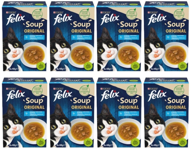 FELIX Leves Eredeti halízű kiegészítő macskaeledel 6x48 g A Felix Soup Original izgalmasan finom levesekből álló készlet macskája számára, amelyek ellenállhatatlanok. Kis huncutkodója imádni fogja a finom húslevest, amelyben lédús darabkákra bukkan. A Felix Soup Original minden egyes fogyasztásra kész tasakja tökéletes méretű ahhoz, hogy macskája a nap bármely szakában