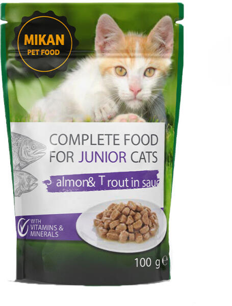 Mikan Cat Pouch Junior Salmon & TroutKényeztesse fiatal macskáját különleges kulináris élménnyel ezzel a Mikan eledellel, amely egy teljes értékű macskaeledel ízletes lazac- és pisztrángmártásban. A speciálisan az egészséges növekedés és fejlődés támogatására kifejlesztett termék biztosítja az aktív és boldog élethez szükséges összes tápanyagot. Az eledel ne