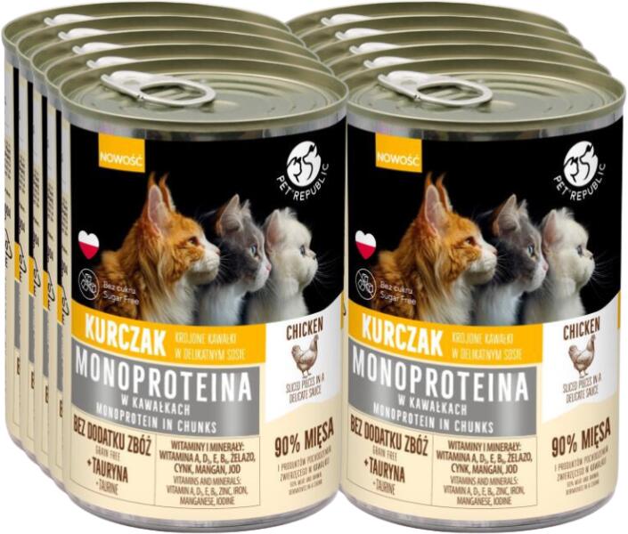 PetRepublic Monoprotein csirke 400g Összetétel: hús és állati eredetű termékek (90% csirkedarabok), növényi eredetű termékek, ásványi anyagok. Analitikai összetevők: nedvességtartalom 81,0%; nyersfehérje 9,5%; nyerszsír 5,5%; nyershamu 3,0%; nyersrost 0,4%. Adalékanyagok/1 kg. Táplálékkiegészítők: taurin 600 mg; cink (cink-oxid) 32,5 mg; mangán (mangán(II)-oxid). 3,12 mg