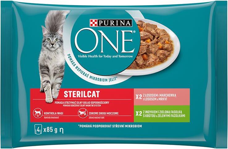 PURINA ONE STERILCAT tasakos eledel - multi-pack pulykával és zöldbabbal szószban, lazaccal és sárgarépával szószban. PURINA ONE tasakos eledel teljes értékű és kiegyensúlyozott eledel, a PURINA állatorvosai és táplálkozástudományi szakemberei által különlegesen kifejlesztve. A jó minőségű tápanyag és a remek íz ideális elegyét képviselik. Biztos lehet abban, hogy