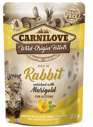 Gabonamentes, cukormentes teljes értékű eledel kölyökmacskák részére. Gabonamentes, cukormentes teljes értékű eledel kölyökmacskák részére. Összetétel: 85% húsfilé (71% csirke, 14% nyúl), 12% hús alaplé, 1% körömvirág, 1% lenmagolaj, 0.5% ásványi anyagok, 0.5% növényi keményítő. Analitikai összetevők: fehérje 9.5%, nyerszsír 4.5%, nyersrost 0.5%, nyershamu 2.5%