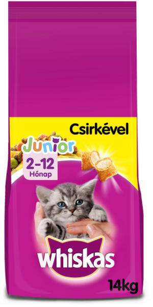 Whiskas Junior száraztáp kiscicák számára csirkével 14kg - teljes értékű macskaeledel kölyök macskák számára Macskaséfjeink keményen dolgoznak azon, hogy olyan ízletes fogásokat készítsenek, amelyek miatt világszerte macskák milliói rohannak a tálkájukhoz izgatottan dorombolva, és elégedetten nyalogatva a bajszukat. Mindegyik fogás szeretettel és gondosan készül, és