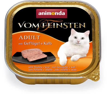 6.4kg Az Animonda Cat Vom Feinsten Adult, szárnyas és borjú egy teljesértékű eledel felnőtt macskáknak alutasakos kiszerelésben.