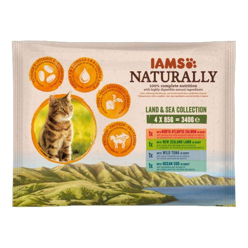 IAMS Naturally Cat felnőtt macskaeledel szószban, többféle ízesítéssel (új-zélandi bárányhús, észak-atlanti lazac, óceáni tőkehal, vadvízi tonhal) Természetes védelem: az E-vitamin támogatja kedvence természetes védekezőrendszerét Egészséges bőr és szőrzet: Omega 3 és omega 6 zsírsavakkal dúsított az egészséges bőrért és szőrzetért Egészséges emésztés: a