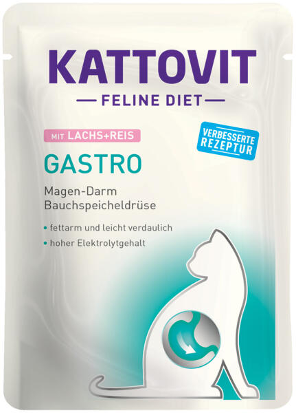 A zooplus. hu kínálatából: A Kattovit Gastro tasakos diétás nedveseledel gyomor-bélrendszeri panaszokkal küzdő macskák számára. Ez a probléma olyan tünetekben nyilvánulhatnak meg, mint a hányás, emésztési zavarok vagy hasmenés. Az emésztőrendszerre nehezedő további terhelés elkerülése érdekében az eledel könnyen emészthető, ám mégis elegendő energiát biztosító