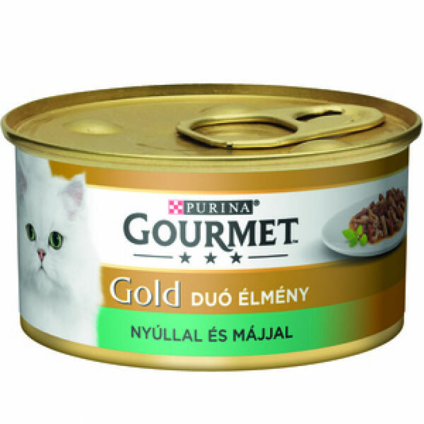 Gourmet Gold Duó Élmény teljes értékű állateledel felnőtt macskák számára nyúllal és májjal 85 gHús és állati származékok (melyből nyúl 4%, máj 4%), Növényi fehérjekivonatok, Gabonafélék, Hal és halszármazékok, Ásványi anyagok, Különféle cukrokAnalitikai összetevők: Nedvességtartalom: 81,5%, Fehérje: 10,0%, Zsírtartalom: 3,0%, Nyershamu: 2,0%, Nyersrost: 0,1