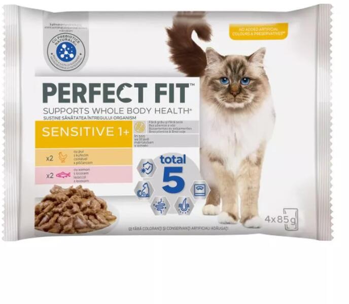PERFECT FIT Sensitive alutasakos macskaeledel csirkével és lazaccal felnőtt macskák számára 4x85g Minden ízletes PERFECT FIT recept egyedi formulát tartalmaz, melyet a Waltham Petcare Science Institute állatorvosaival és táplálkozási tanácsadóival közösen fejlesztettünk ki. A PERFECT FIT támogatja macskája egész testének egészségét annak érdekében, hogy macskája minden