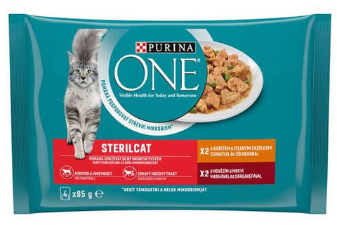 Purina One Sterilcat csirkével és marhával nedves macskaeledel 4x85g nedves macskaeledel, csirke, marha Összetétel: Hús és állati származékok (melyből marha 4%), Növényi fehérjekivonatok, Hal és halszármazékok, Növényi eredetű származékok (inulin 0,55%), Ásványi anyagok, Olajok és zsírok, Zöldségek (0,6% dehidratált sárgarépa, egyenértékű 5,4% sárgarépával), K