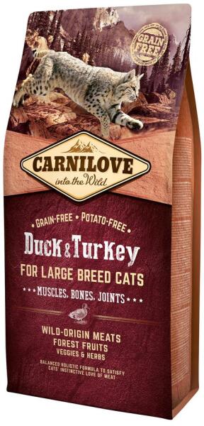 Carnilove Duck & Turkey for Large Breed Cats - Muscles, Bones, Joints GABONA- ÉS BURGONYAMENTES ELEDEL NAGYTESTŰ MACSKÁK RÉSZÉRE. A NAGY TESTŰ MACSKÁK IZMAI, CSONTJAI ÉS ÍZÜLETEI ÁLLAPOTÁNAK JAVÍTÁSA ÉRDEKÉBEN KIFEJLESZTETT ELEDEL. OLYAN FAJTÁK RÉSZÉRE, MINT MAINE COON, AMERIKAI CSONKAFARKÚ, RAGDOLL, SZAVANNA, CHAUSIE, SZIBÉRIAI MACSKA, NORVÉG ERDEI MACSKA, OCICAT. TELJES