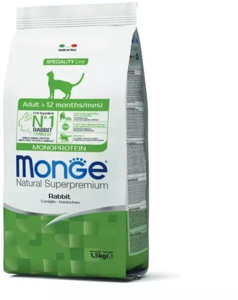 Monge Cat Speciality Line Monoprotein Adult - RabbitTeljes értékű, kiegyensúlyozott szárazeledel felnőtt macskák számára. Kizárólag egyféle friss húsból származó állati fehérjét tartalmaz, ami ízletessé és könnyen emészthetővé teszi. A termék xylo-oligoszacharideket és probiotikumokat tartalmaz a megfelelő emésztés céljából. A kiválasztott összetevőknek köszö